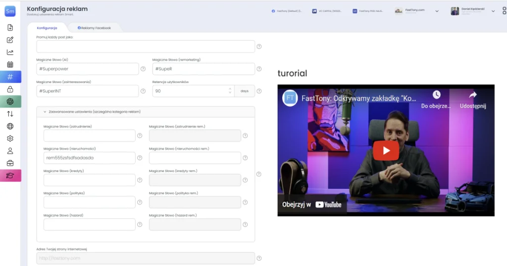 Konfiguracja: W trakcie konfiguracji aplikacji FastTony ustaw „Magiczne Słowo”. To unikalne słowo, którego będziesz używać do identyfikowania postów, które mają zostać automatycznie przekształcone w reklamy.