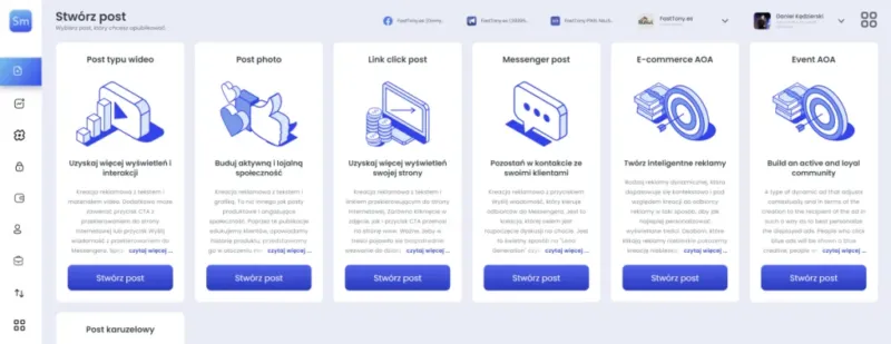W FastTony Smart masz jeszcze możliwość publikowania postów na Twoim fanpage. Tutaj masz kilka rodzajów: