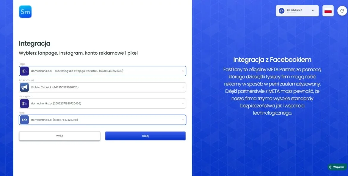 Po tym, jak już zakupiłeś subskrypcje i zalogowałeś się przez swój profil na Facebooku, musisz uzupełnić swoje zasoby. Czyli w wygranych miejscach dodać FanPage, konto reklamowe, konto na Instagramie oraz Pixel. Jesteś ich administratorem, i po zalogowaniu Facebookiem będziesz je mieć automatycznie do wyboru na liście.