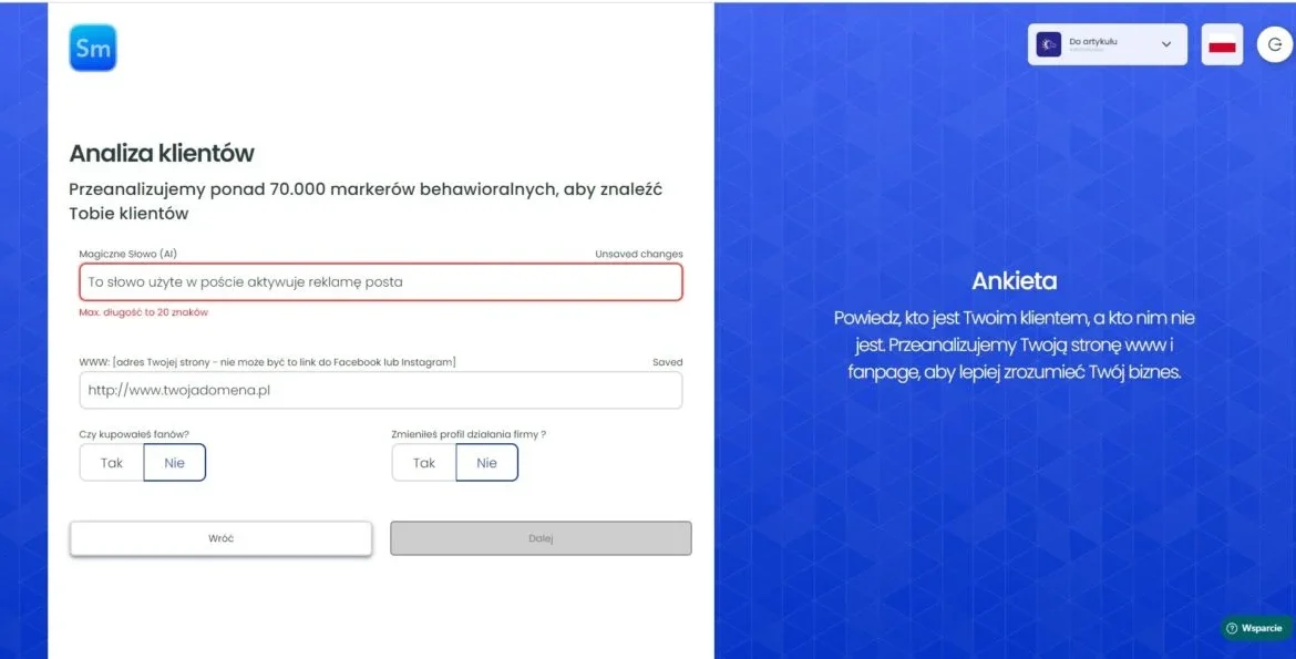 Ważne! Jeśli podczas konfiguracji, narzędzie pominęło wpisywanie zainteresowań. Przejdź do zakładki Reklamy Facebook i wpisz je w taki sam sposób jak pokazałam na screenie z początkowych ustawień.