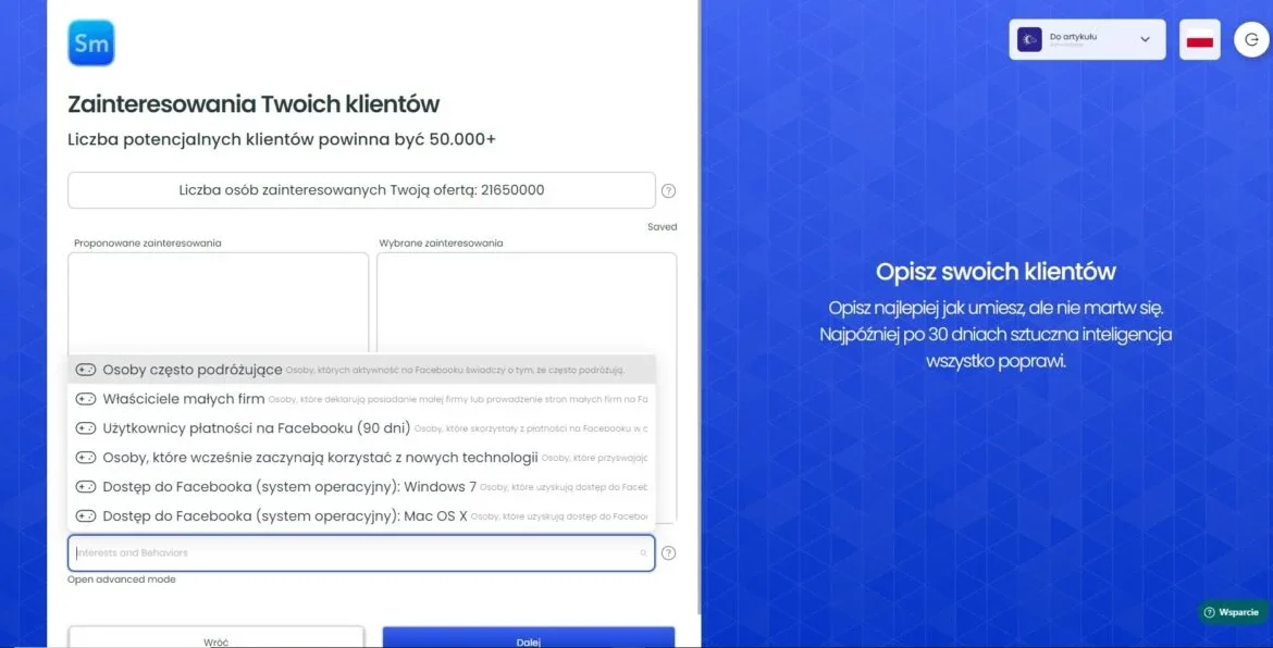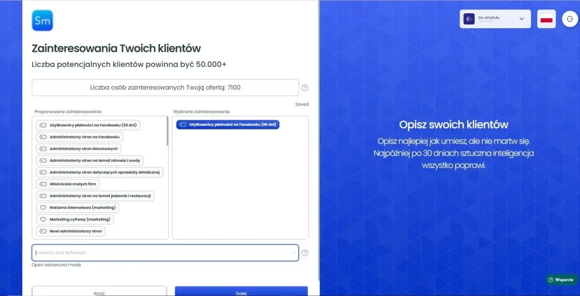 Teraz po przejściu dalej, zobaczysz okienko do wpisania zainteresowań. Jeśli Twój pixel posiada wystarczająco dużo danych, ten krok zostanie pominięty. Jest to całkowicie normalne. Jeśli jednak tych danych jest za mało, to zainteresowania musisz określić. Co ważne, wystarczy, że w okienko wpiszesz jedno główne, a system automatycznie zacznie ci podpowiadać kolejne. Dokładnie jak na drugim screenie poniżej. To kolejna zaleta FastTony.