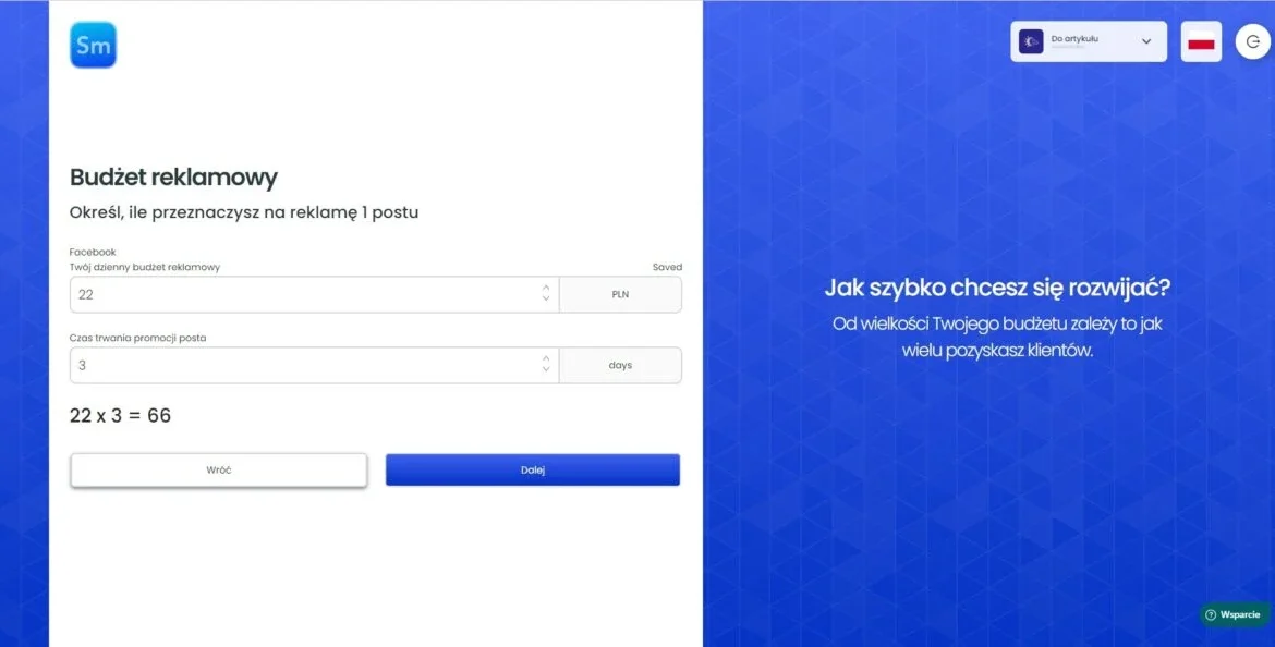 Jeśli już wybrałeś zainteresowania. Ważne! Nie wybieraj więcej niż 10. Lub, jeżeli FastTony pominął ten krok z uwagi na wysączająca ilość danych analitycznych. W kolejnym kroku będziesz mieć możliwość określenia budżetu dziennego do promowania posta i czasu trwania kampanii.