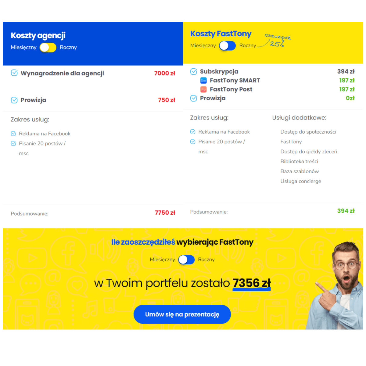 Jedną z największych korzyści korzystania z narzędzi FastTony jest oszczędność pieniędzy. I to chyba największa zaleta. Współpraca z agencją reklamową to koszt średnio 7 tysięcy złotych za obsługę reklamy na Facebooku, Instagramie, budowania contentu w mediach społecznościowych. Dodatkowo większość agencji pobiera również prowizję od zarządzania budżetem. Średnio jest to od 10 do 20 procent. Oznacza to, że im więcej inwestujemy w marketing, tym więcej kosztuje nas jego obsługa.